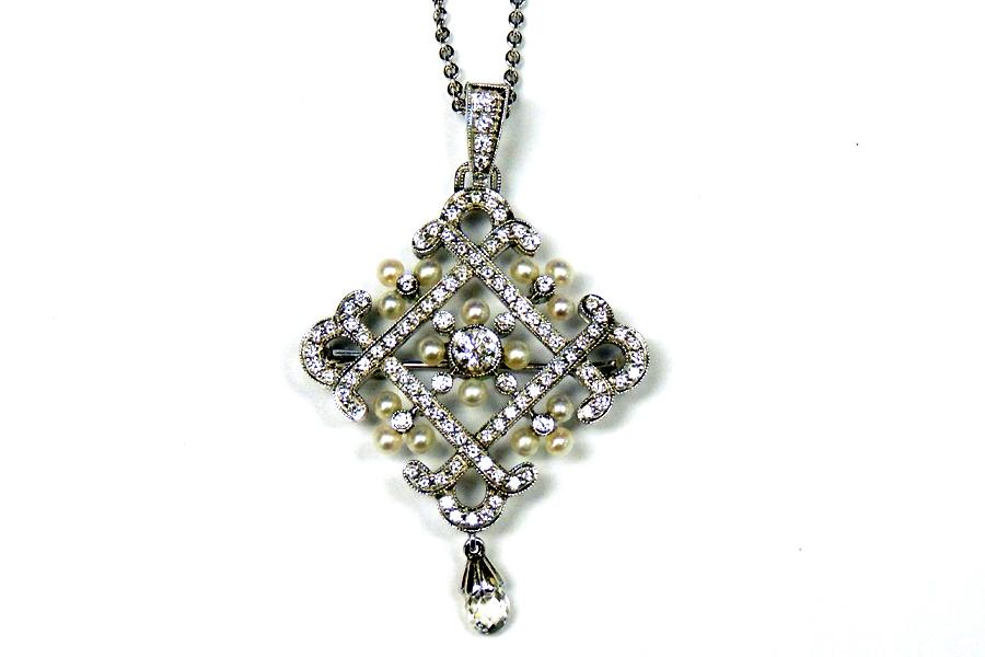BL565 - Platinum diamond and pearl pendant with chain. Center Diamond = .98ct Diamonds = 1.30 carats total weight Pearls = 16 Chain = 16" 1.50mm, cable link