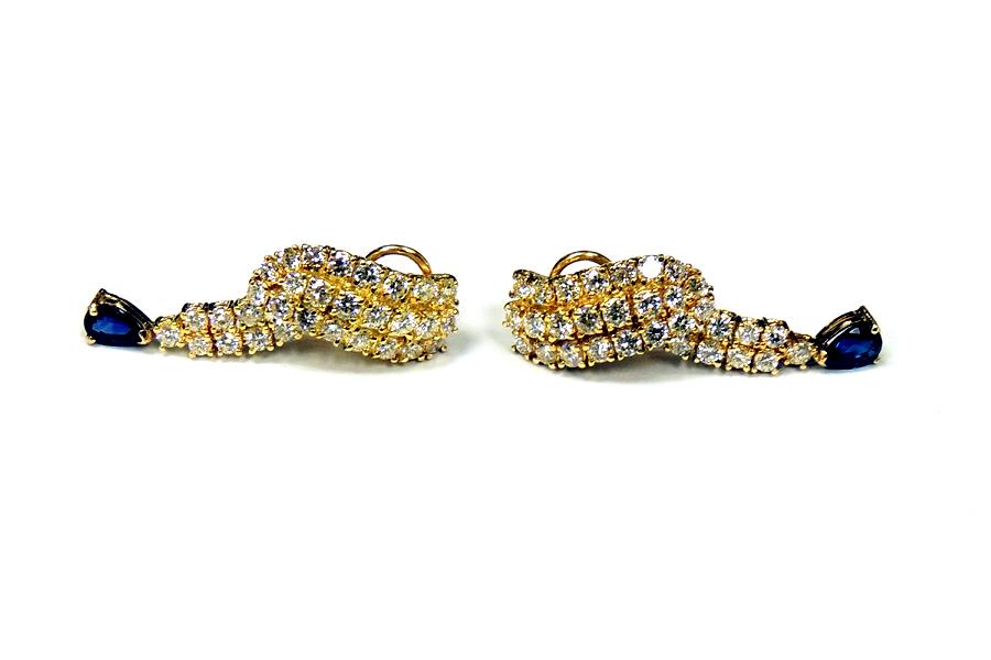 18KT yellow gold sapphire & diamond earrings. Diamonds = 4.70 carats total weight Sapphires = 1.45 carats total weight Earrings have omega clips and friction posts.