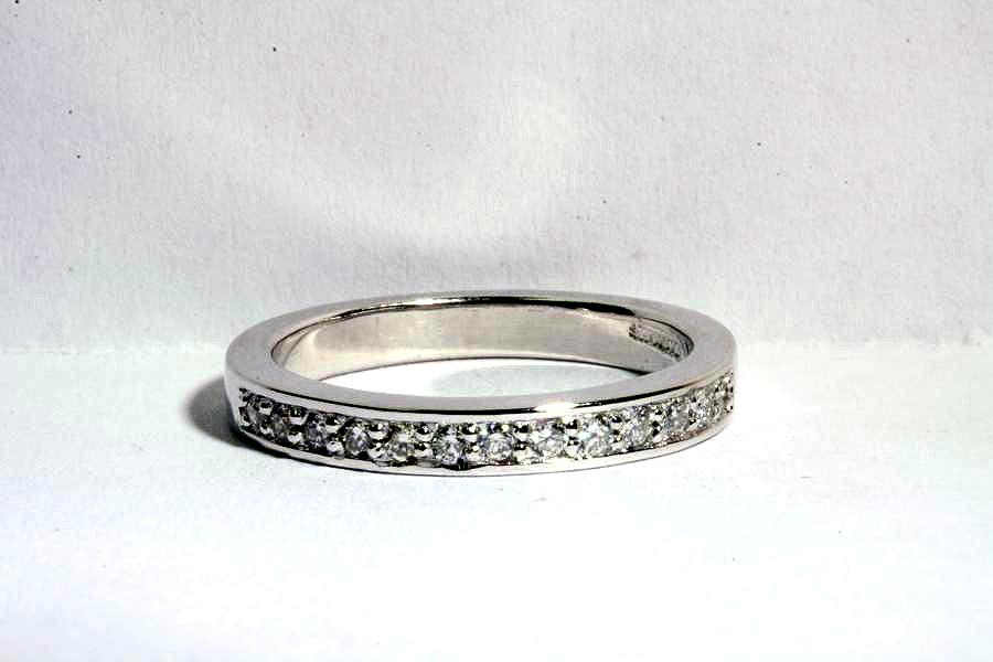 LB - 059 - Lady's 14KT white gold diamond wedding band. Set across top of band, bead set, are thirteen round, brilliant cut diamonds weighing .22 carats total weight, with color G-H, clarity SI 1 to SI 2. Band weighs 3.8 grams.