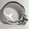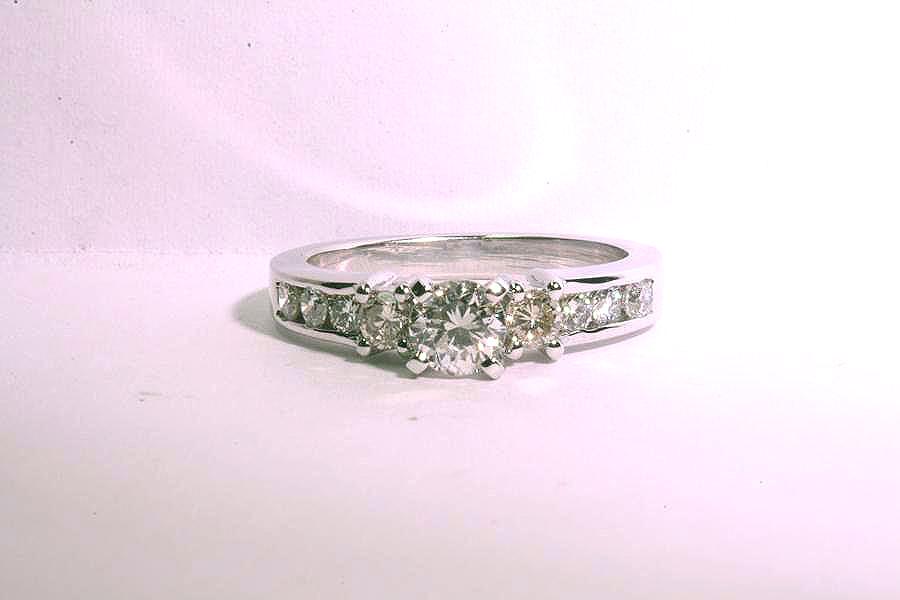 ![]() Lady's 14KT white gold diamond three stone ring. Set in center, in four prongs, is one round, brilliant cut diamond weighing .57ct, with color H, clarity SI 1. Each side of center, prong set, is one round, brilliant cut diamond (two total), weighing .33 carats total weight, with color I-J, clarity SI 1. |
