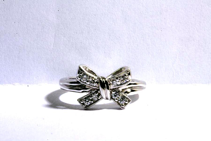 LR - 417 - Lady's 14KT white gold diamond bow ring. Bead set, across bow, are six round, brilliant cut diamonds, with color G-H, clarity SI 1 to SI 2. Ring has a milgrain finish.