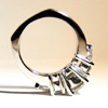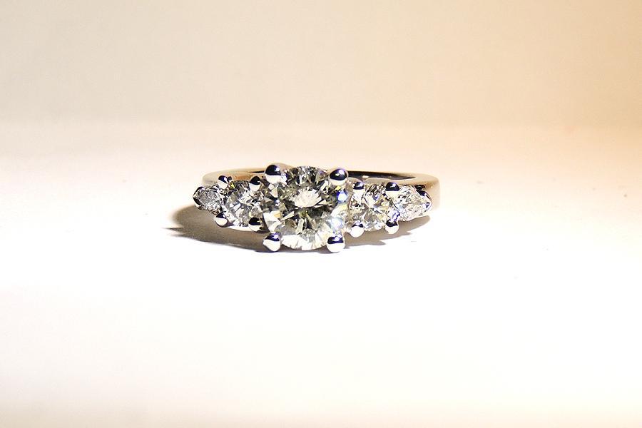 ![]() LR - 464 - Lady's 14KT white gold diamond engagement ring. Set in center, in four prongs, is one round, brilliant cut diamond weighing 1.23ct, with color I, clarity SI 2. Each side of center, in four prongs, is one round, brilliant cut diamond (two total), weighing .50 carats total weight, with color H, clarity SI 1. On the outside of each round diamond is a pear shaped diamond (two total), prong set, weighing .26 carats total weight, with color H, clarity SI 1. Shank of ring is European and measures 2.98mm. RIng weighs 7.0 grams. |
