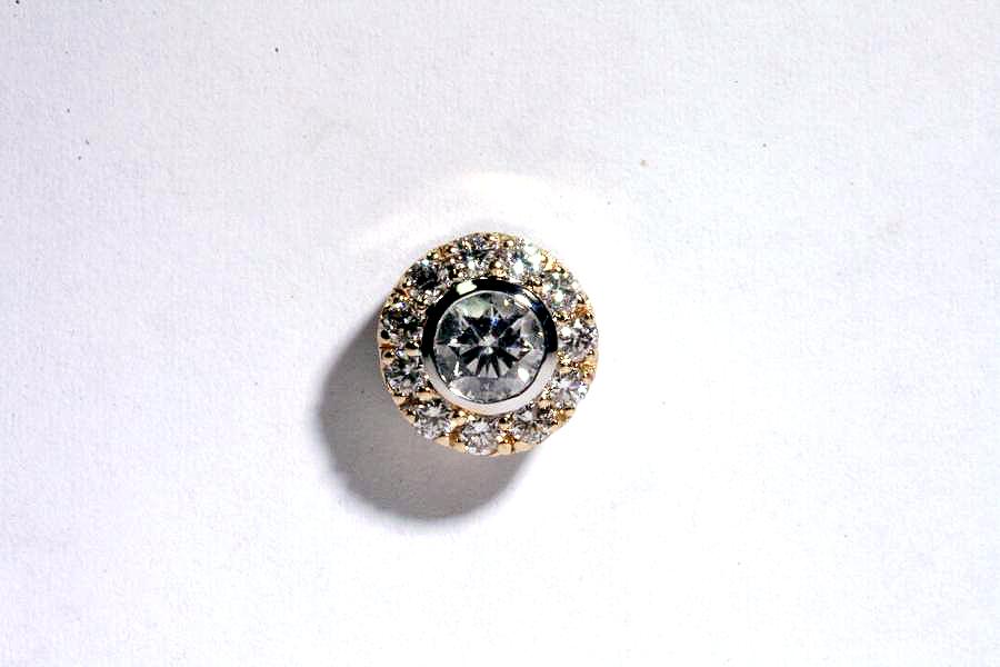 ![]() PD - 053 - 14KT white gold diamond halo pendant. Bezel set in center, is one round, brilliant cut diamond weighing .40ct, with color H, clarity SI 1 to VS 2. Bead set around center, are eleven round, brilliant cut diamonds weighing .33 carats total weight, with color G-H, clarity SI 1 to VS 2. |