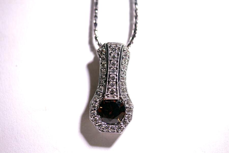 ![]() PD - 074 - 14KT white gold diamond banjo pendant. Set in center, in four prongs is one round, fancy cognac colored diamond weighing .72ct. Bead set across the rest of the pendant, are thirty nine round, brilliant cut diamonds weighing .20 carats total weight, with color G-H, clarity SI 1 to VS 2. Pendant has a milgrain finish. |