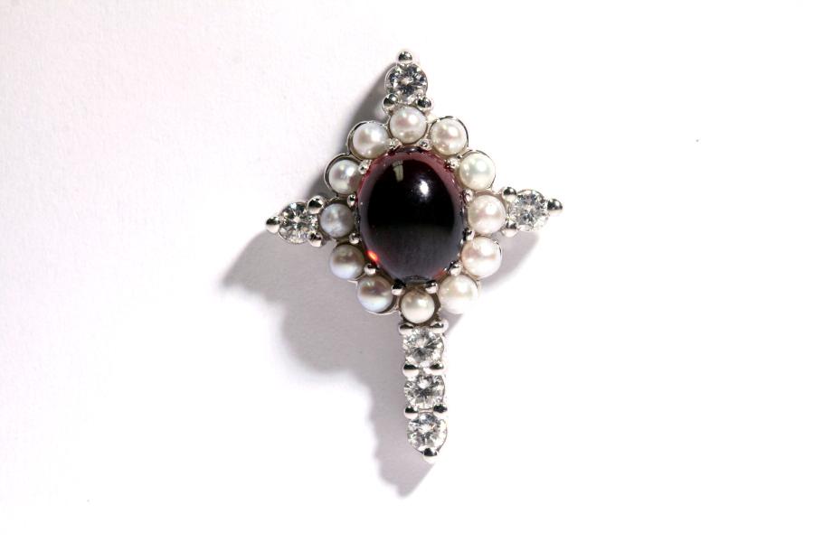 ![]() CR - 093 - 14KT white gold diamond, pearl, and garnet cross pendant. Set in center, is one cabechon garnet measuring 10mm X 8mm. Set around center, are 2.50mm white, cultured pearls. Prong set across pendant are six round, brilliant cut diamonds weighing .27 carats total weight, with color G-H, clarity SI 1 to VS 2. |