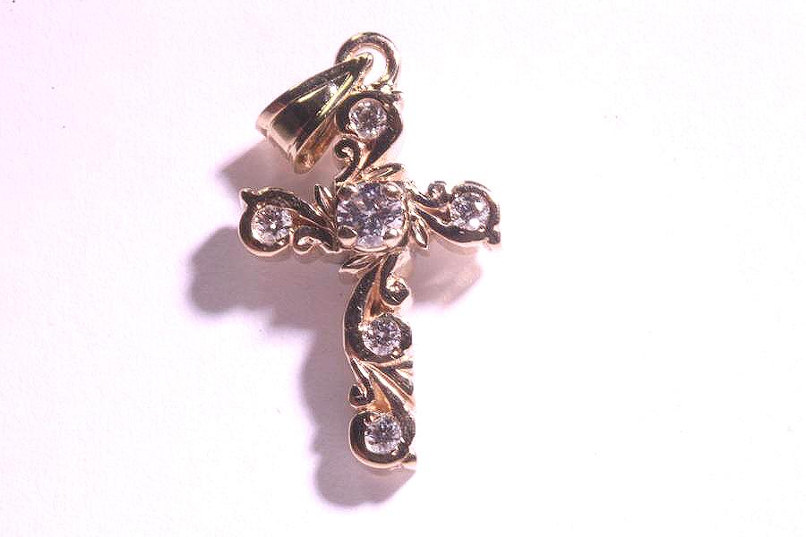 ![]() CR - 009 - 14KT yellow gold diamond cross. Prong set, in center, is one round, brilliant cut diamond weighing .10 carats total weight, with color G-H, clarity SI 1 to VS 2. Set across cross, are five round, brilliant cut diamonds weighing .40 carats total weight, with color G-H, clarity SI 1 to VS 2. |